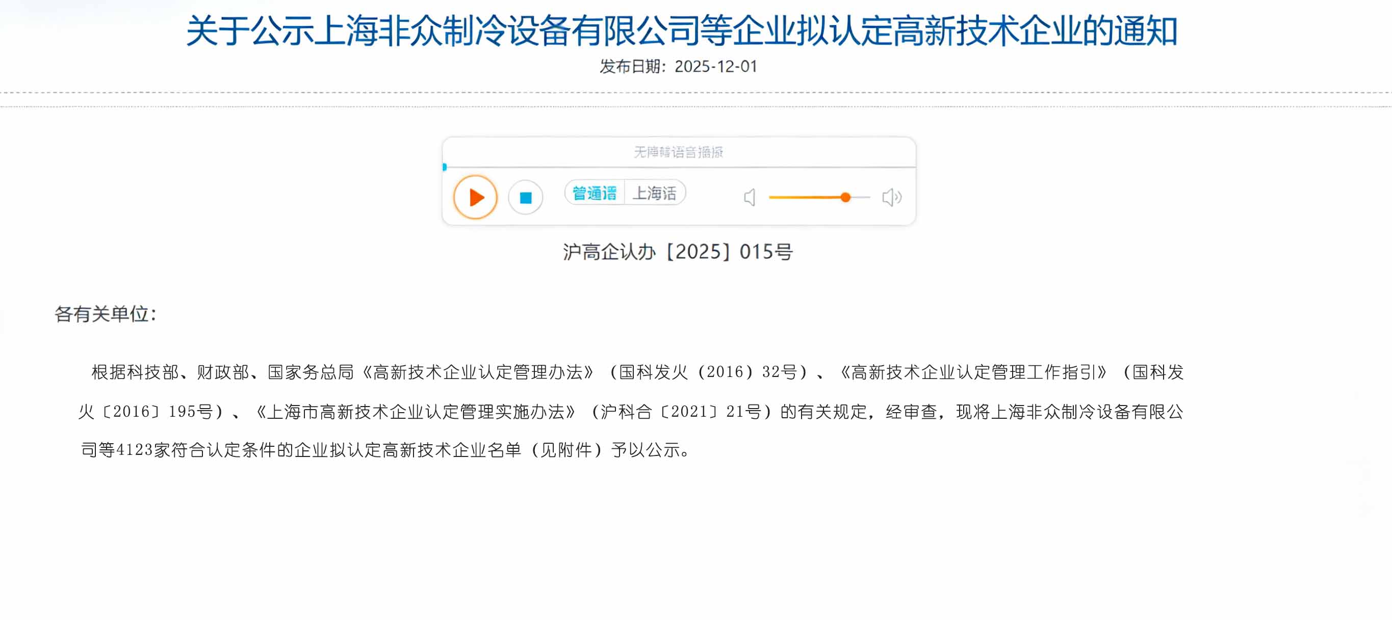 近日,根據(jù)科技部、財政部、國家稅務(wù)總局《高新技術(shù)企業(yè)認(rèn)定管理辦法》(國科發(fā)火〔201632號)、《高新技術(shù)企業(yè)認(rèn)定管理工作指引》(國科發(fā)火〔2016195號)、《上海市高新技術(shù)企業(yè)認(rèn)定管理實(shí)施辦法》(滬科合〔202121號)的有關(guān)規(guī)定,經(jīng)審查,現(xiàn)將上海非眾制冷設(shè)備有限公司等4123家符合認(rèn)定條件的企業(yè)擬認(rèn)定高新技術(shù)企業(yè)名單(見附件)予以公示。